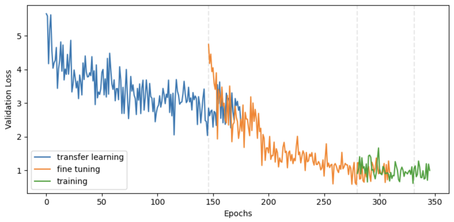 Cosine-margin-triplet loss on the validation dataset over each phase of training. The epoch with the best loss is marked with a vertical dashed line for each phase.