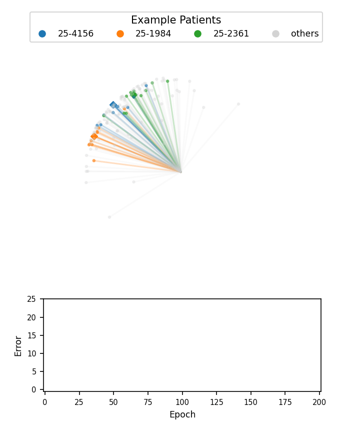 A visualization of face embeddings in three dimensions. Vectors that end in a dot are embeddings of a single photo, and vectors that end in a diamond are the average embedding of all photos for a given patient. As model training progresses, embeddings of different patients are pushed further apart. Note that the actual embeddings used in our system lie on a 128-dimensional hypersphere, rather than the 3-dimensional sphere used for this visualization.